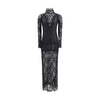 The long dress by Paco Rabanne combines elegance and sensuality through an intricate play of textures. Crafted from floral lace and ivory stretch viscose jersey, it embraces the silhouette with a fitted shape that enhances its natural lines. The high neck and long sleeves add a sophisticated touch, while scalloped hems and a central back slit bring fluidity and femininity. An iconic piece that embodies the bold yet refined spirit of the Maison.